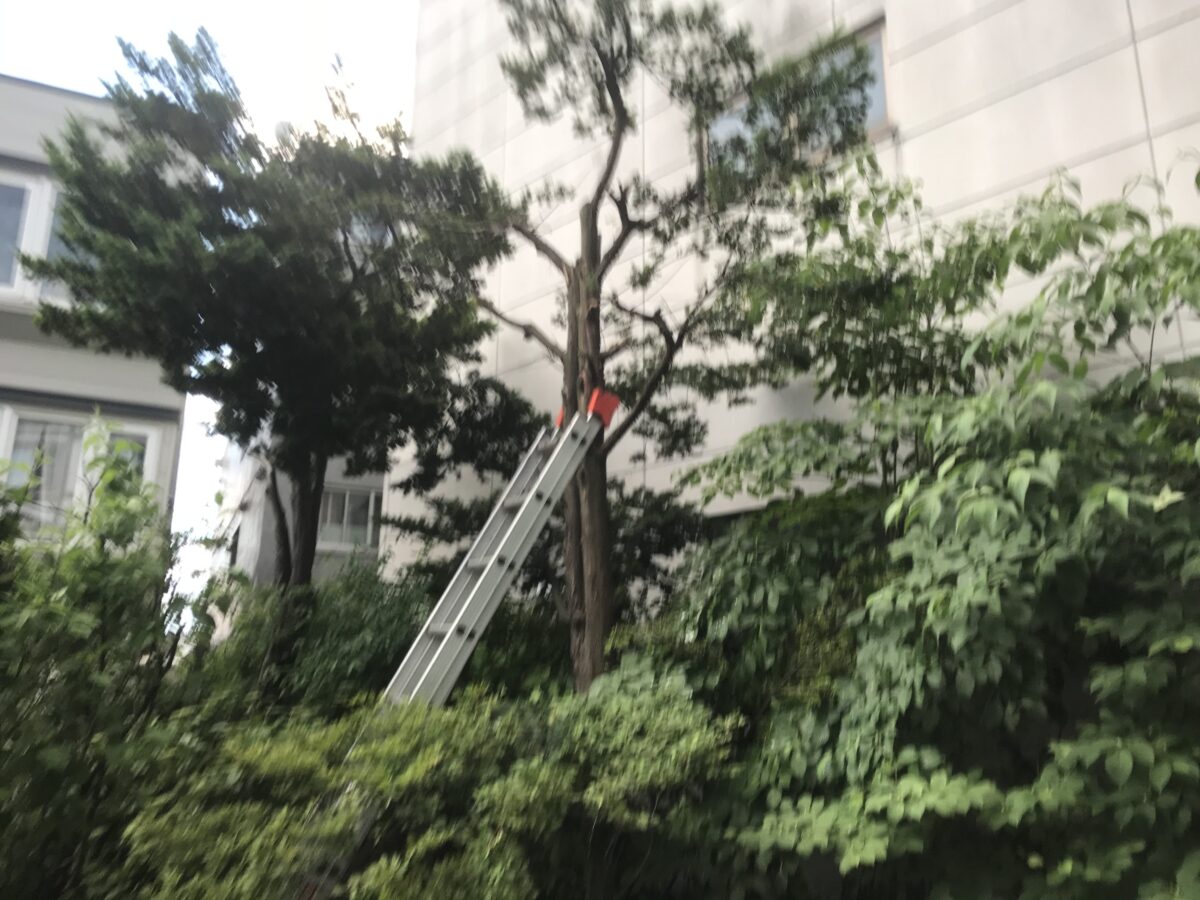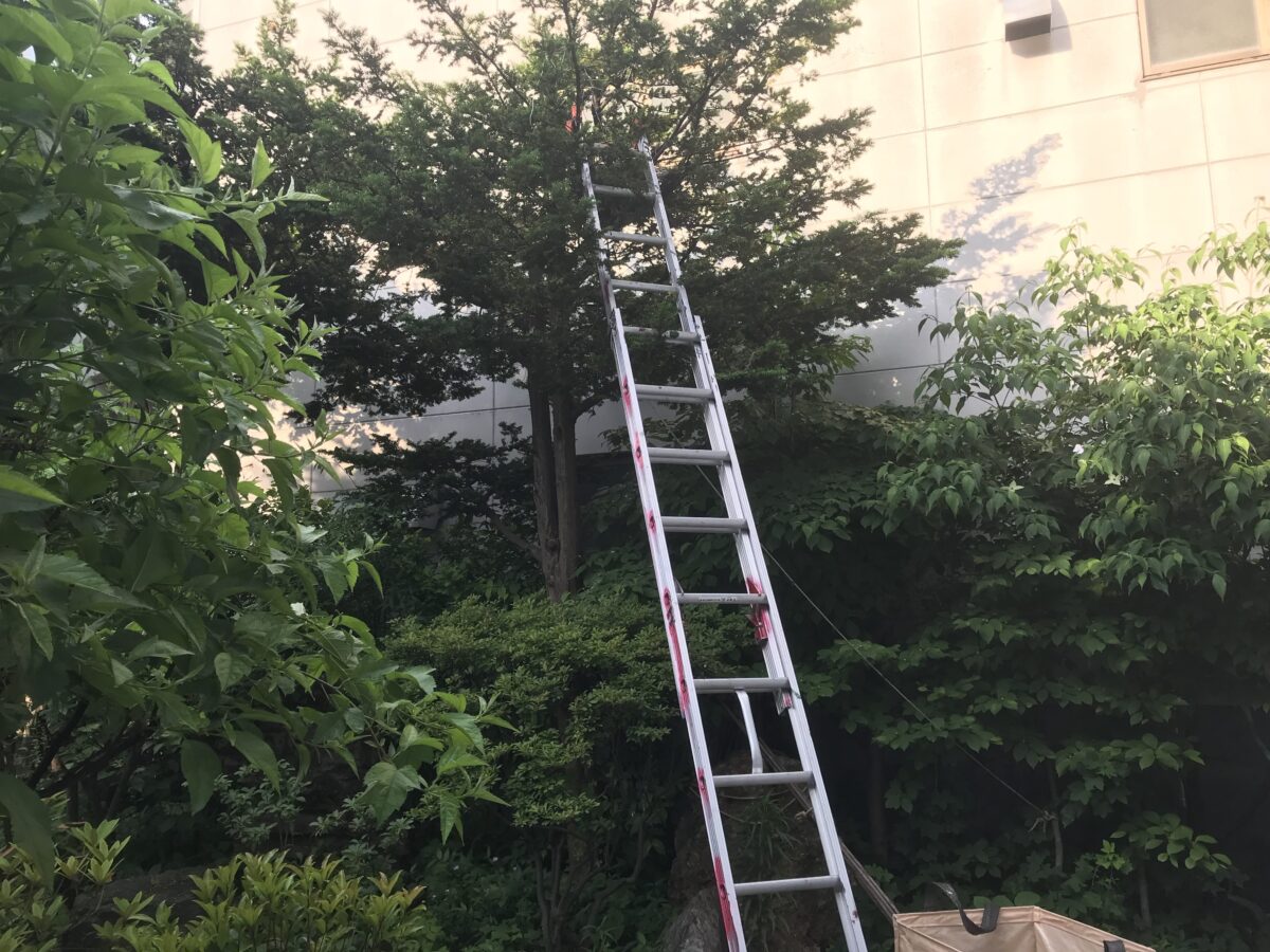 さて、許可申請も済ませたのでいよいよ駆除作業開始です。相変わらず親カラスの威嚇行為は激しく、ハシゴひとつ準備するのもカラスたちの居場所をよく確認して常に攻撃に備えなければなりません。