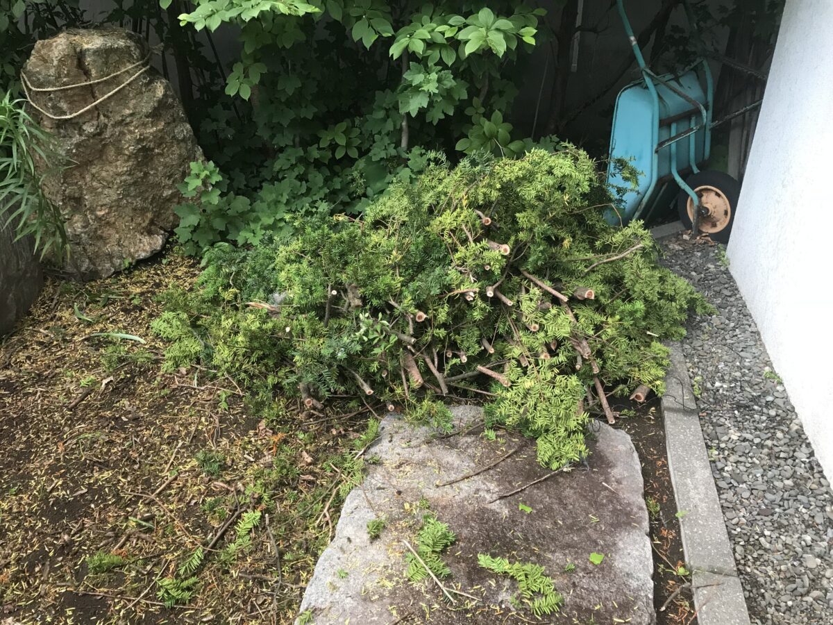 切った枝木は依頼主様自身で捨ててくれるとのこと。処分しやすいようになるべく短めに細かくカットしました。