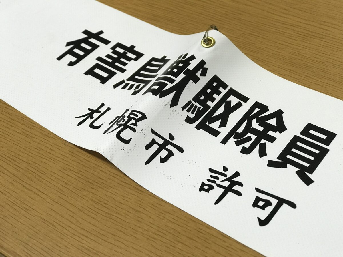 これは札幌市から正式に駆除の許可をもらっている証なので、駆除作業時にはつけるようにしています