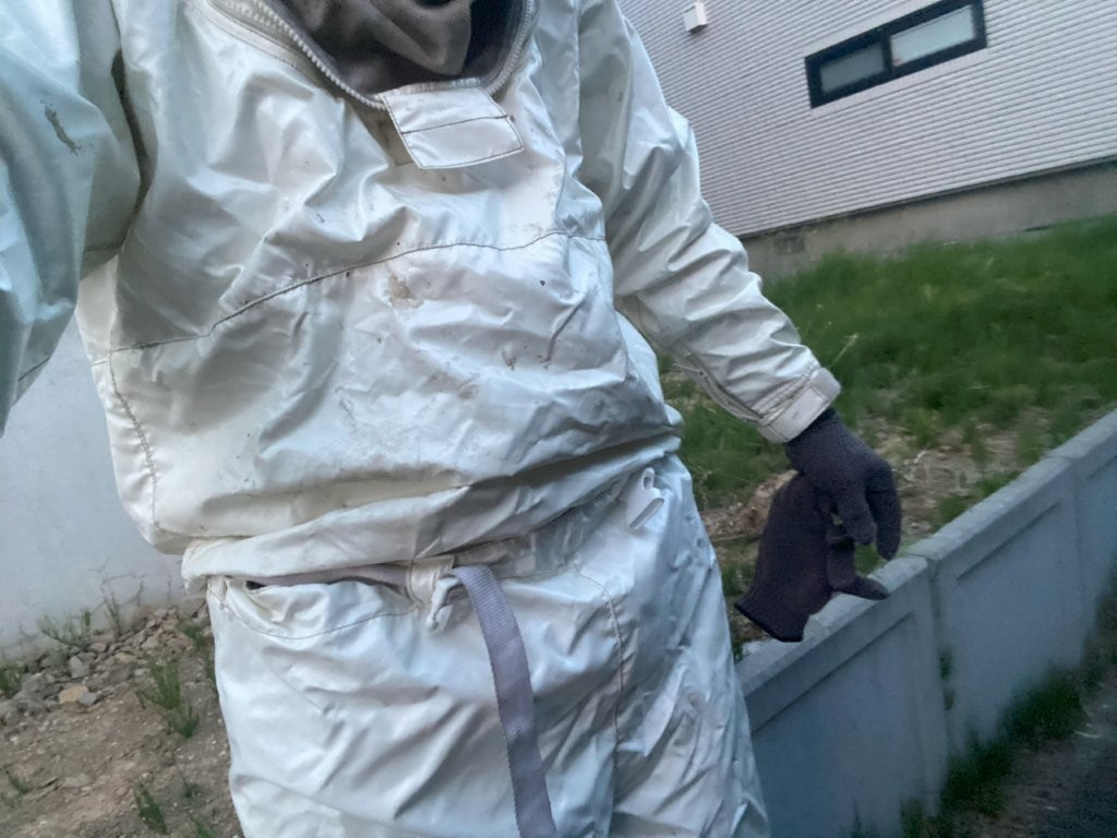 まずはプロ仕様の防護服(写真参照)を着用し、毒針から全身を保護します。 - 薬剤による駆除と鎮圧