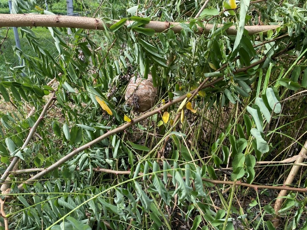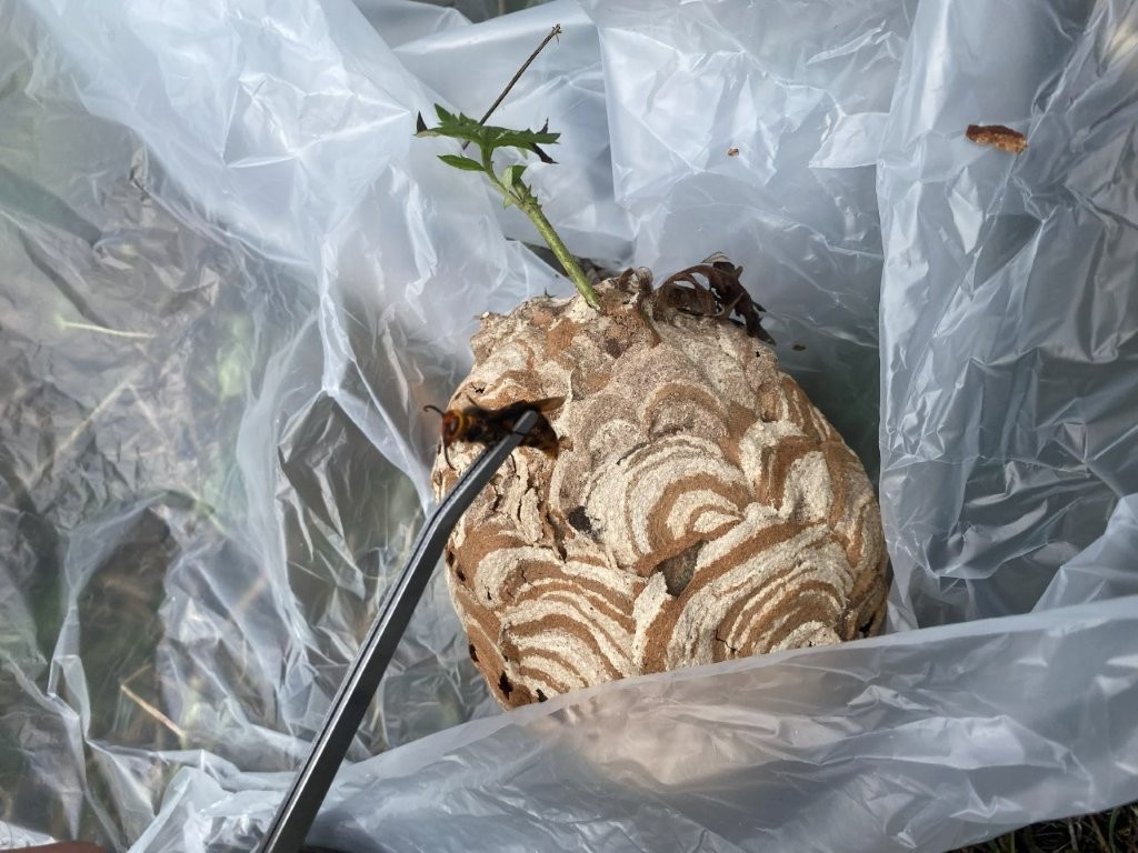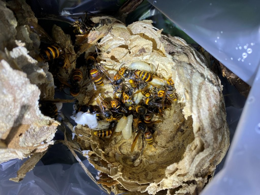 写真にあるような巣を発見したら、絶対に近づかないでください。特に今回行った撤去作業では、常に攻撃性の高い大型のスズメバチ(画像参照)を確認しており、放置は大変危険な状態でした。