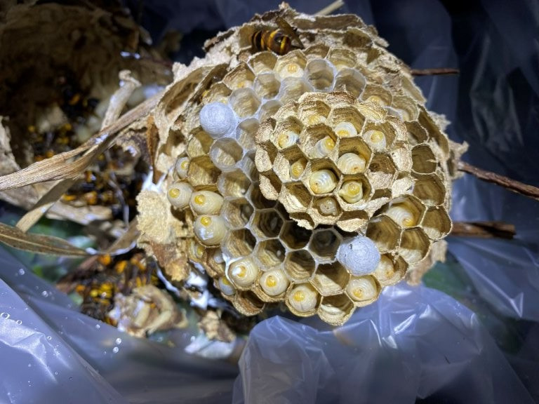 蜂の活動が完全に停止したことを確認し、巣本体(画像参照)を慎重に撤去・回収します。再発防止のため、巣があった周辺も処理します。