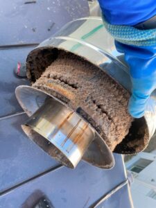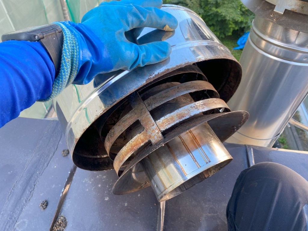 そのような清掃状況を長く続けたことで煙の吸い込みが悪くなったそうです。清掃ができてない煙突のトップが怪しいということで清掃することとなりました。