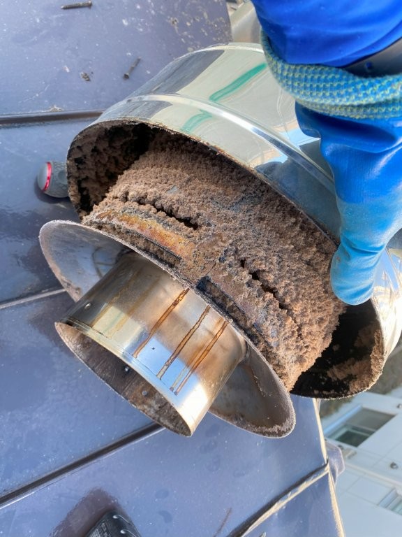 煙突トップは煤(これは煤というのかな?)でしっかりと詰まっていました。出口がほとんどなくなり煙の逆流の原因であることは明白でした。