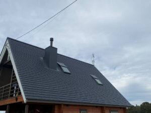 今回作業させていただいた住宅は、ご覧の通り急勾配の三角屋根です。屋根の上には煙突と天窓(トップライト)が見えますが、この傾斜では慣れていない方の作業は非常に危険が伴います。