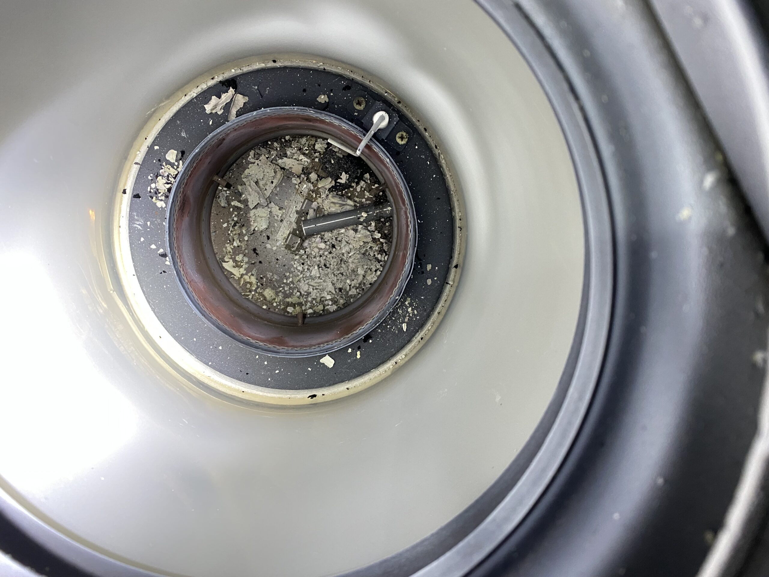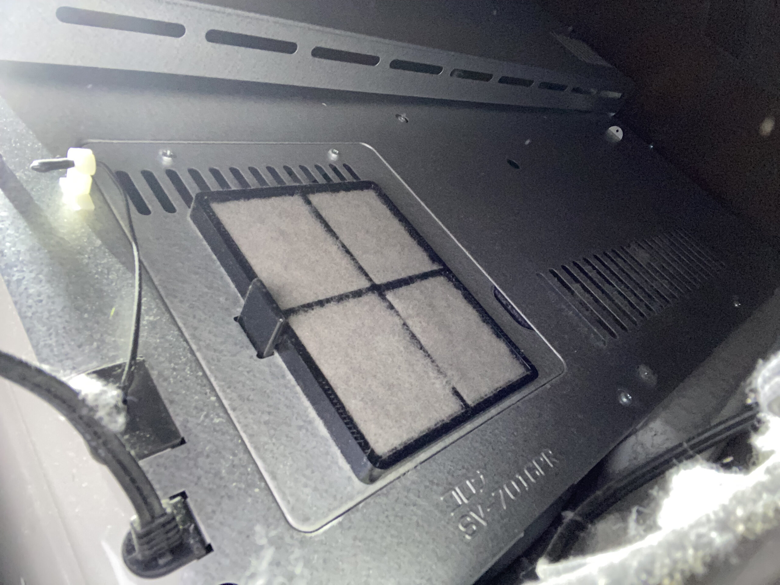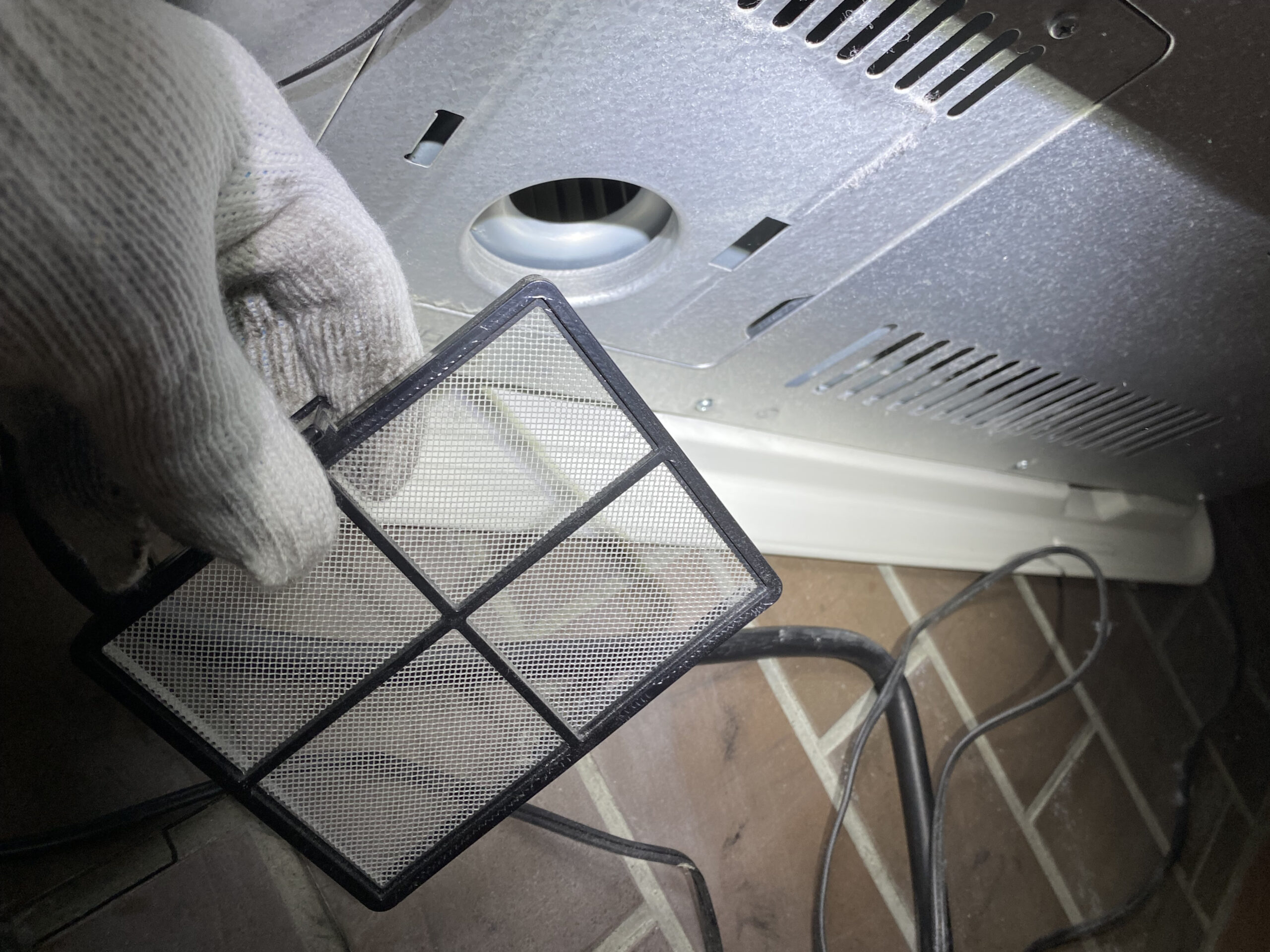 ストーブ裏の吸気ファンを確認したところ、大量の埃が詰まっていました。(画像参照)これが酸素不足の直接的な原因だったため、埃を完全に除去し、清掃しました。 - 燃焼部分の清掃