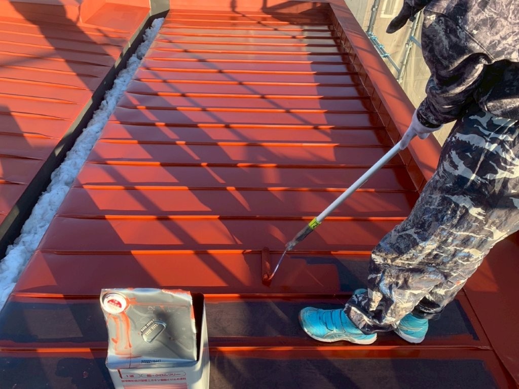 屋根材のサビの進行を食い止め、上から塗る塗料を密着させるための錆止め塗料を塗布します。(画像参照) - 中塗り