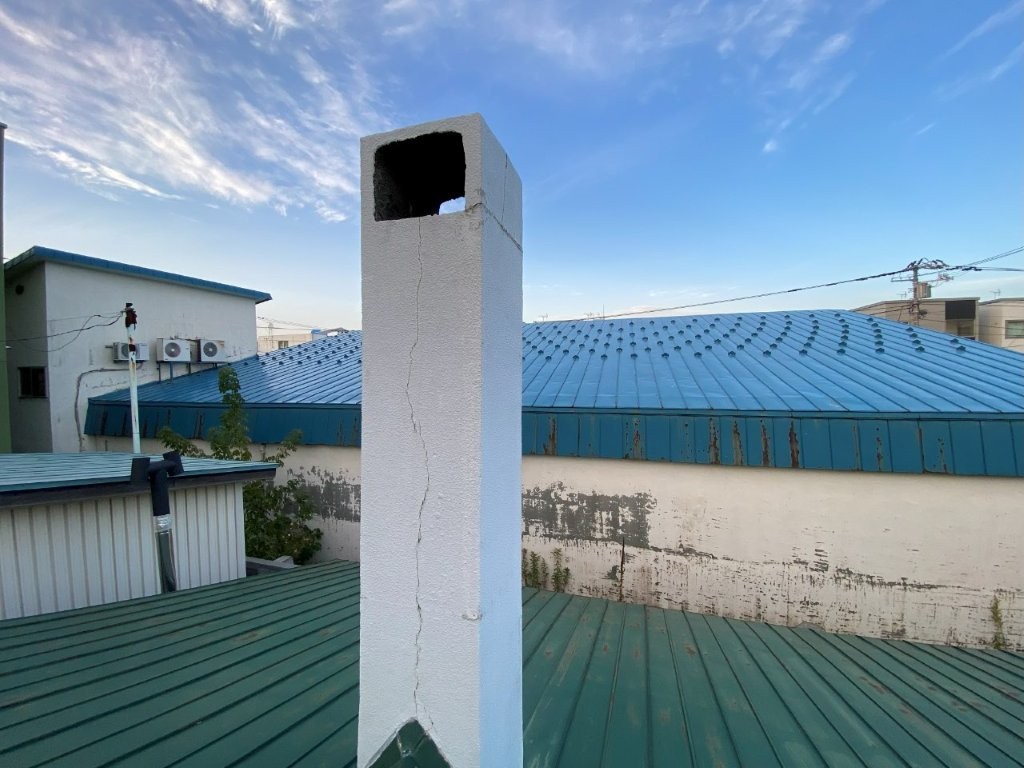 写真にもあるように、集合煙突に大きなひび割れ(クラック)が発生しており、このまま放置すると最悪の場合は倒壊の危険もある状態でした。