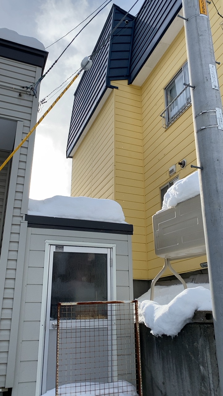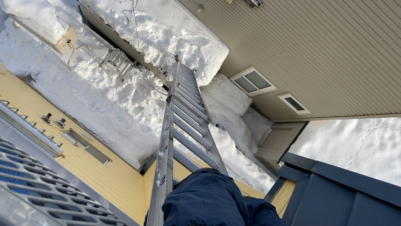 物置の屋根には雪が積もっていましたが、実はこれが幸いしました。はしごの足が雪にグサッと深く刺さることで、左右や上下のブレがなくなり、通常よりも安定して固定することができたのです。