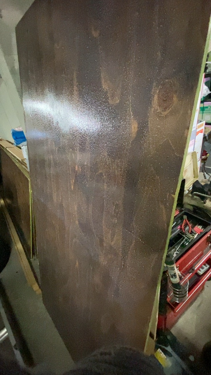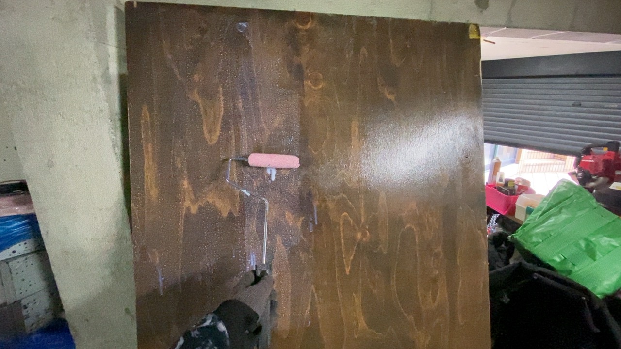 塗りたてのコンパネは、写真のようにテカテカと光を反射します。これを丸一日しっかり乾燥させれば完成です。