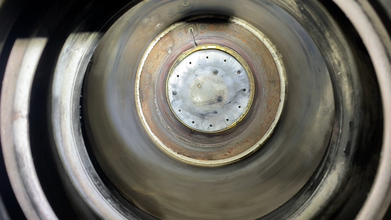 【画像解説】1枚目が清掃前。煤がびっしりとこびりつき、空気の通り道を塞いでいます。2枚目が専用工具で清掃した後の状態で、金属の地肌が見えるまで綺麗になりました。