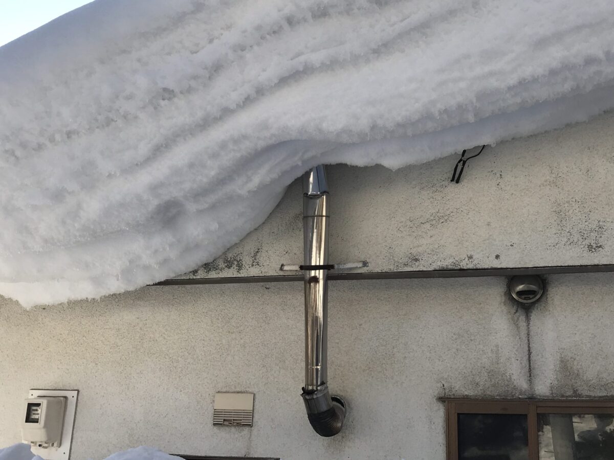 屋根の上には1メートルを優に超える雪が積み上がり、その重みで軒先の雪が巻き込み、今にも下の窓や隣家の敷地へ崩落しそうな状態でした。これほどの規模になると、落雪の衝撃は車を大破させ、最悪の場合は人命に関わる事故に繋がります。