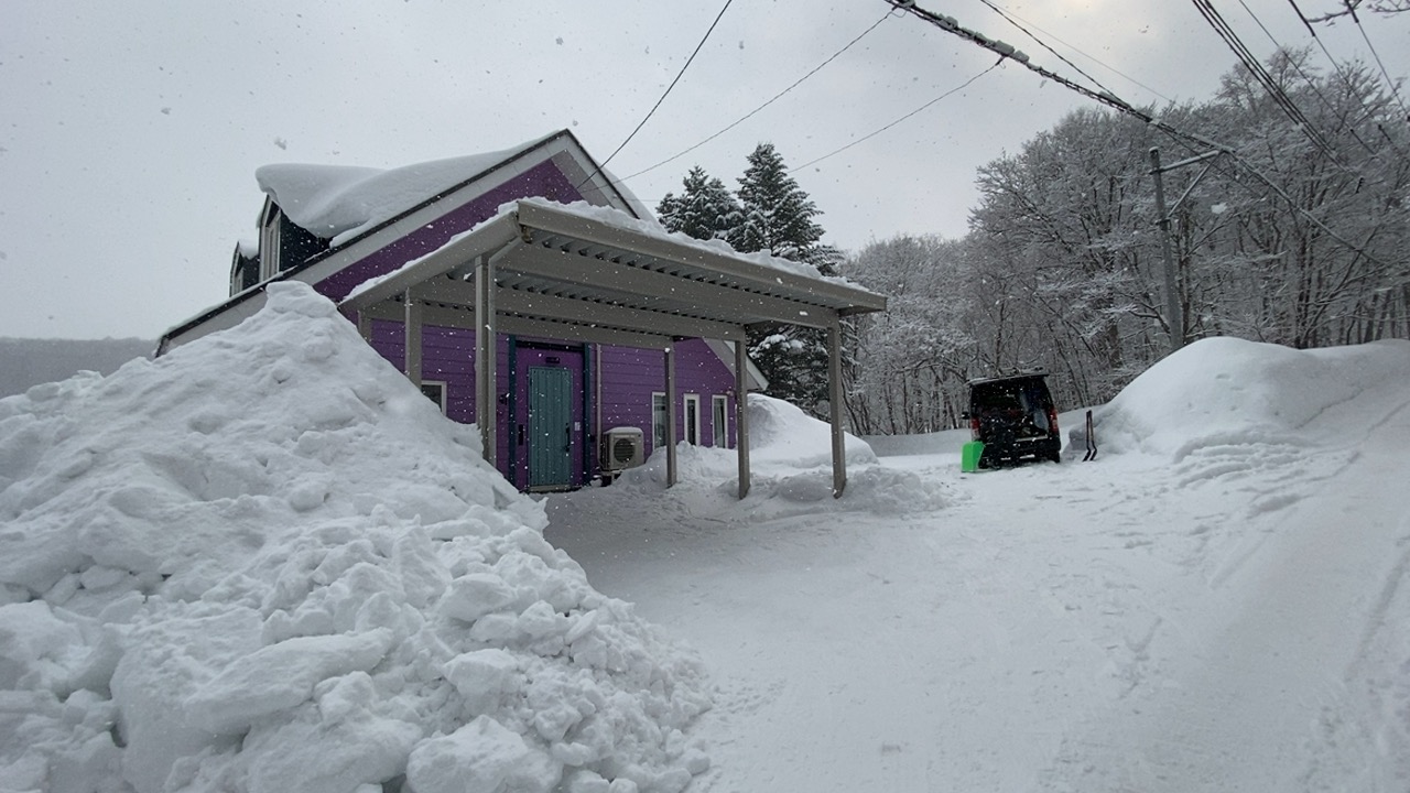 雪下ろし作業は、スチールのスコップを全力で叩き込まなければ刺さらないほどの硬雪との戦いでした。2名体制で約1時間半、ノンストップでの重労働です。