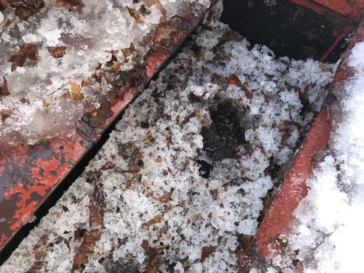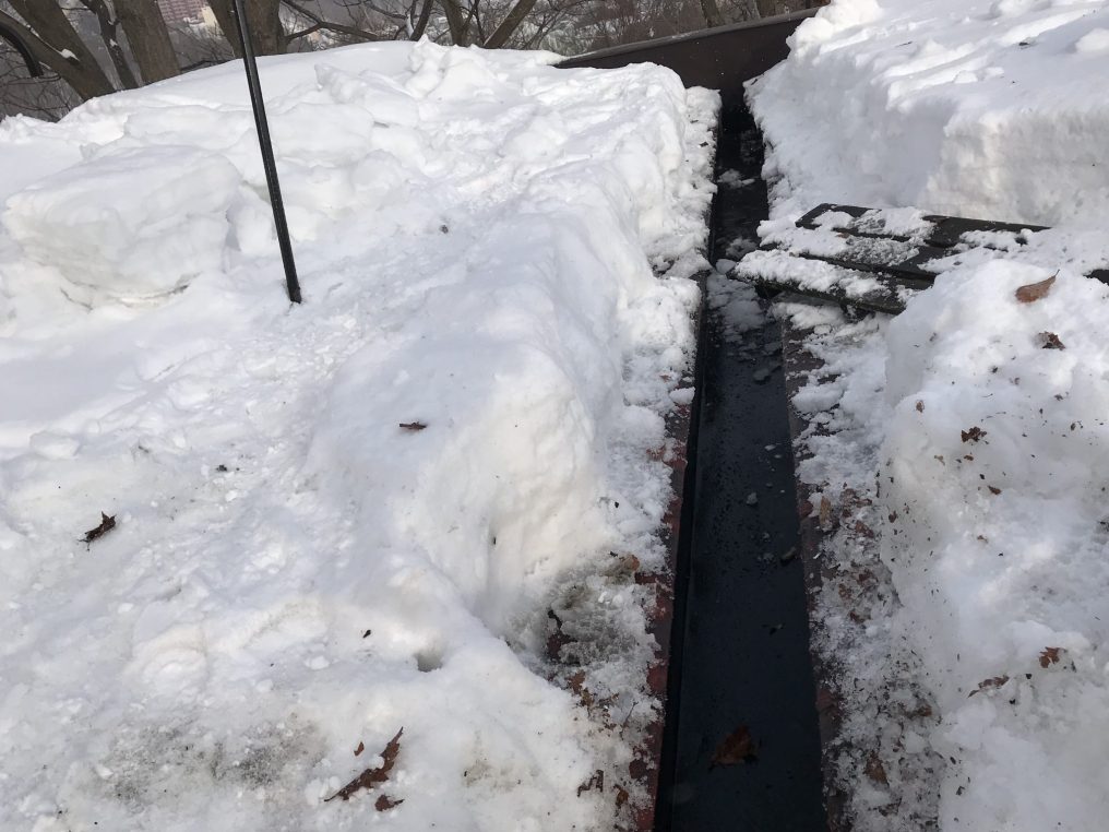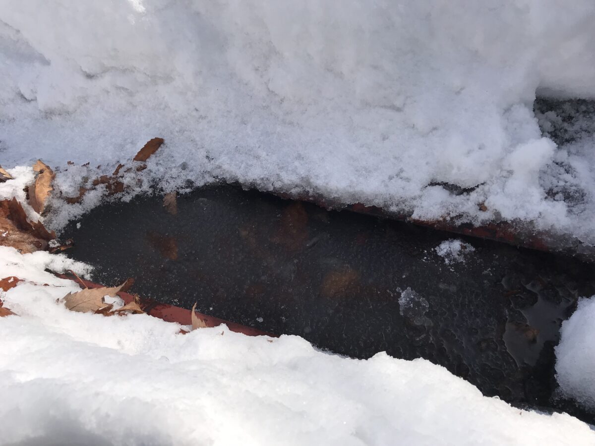 屋上の中心を通る「スノーダクト(樋)」が完全に氷水で埋め尽くされていました。