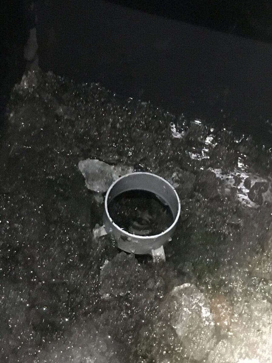 作業は、まず排水口(ドレン)の位置を特定することから始まります。お湯を使いながらピンポイントで氷を溶かし、慎重に氷を割り進めます。
