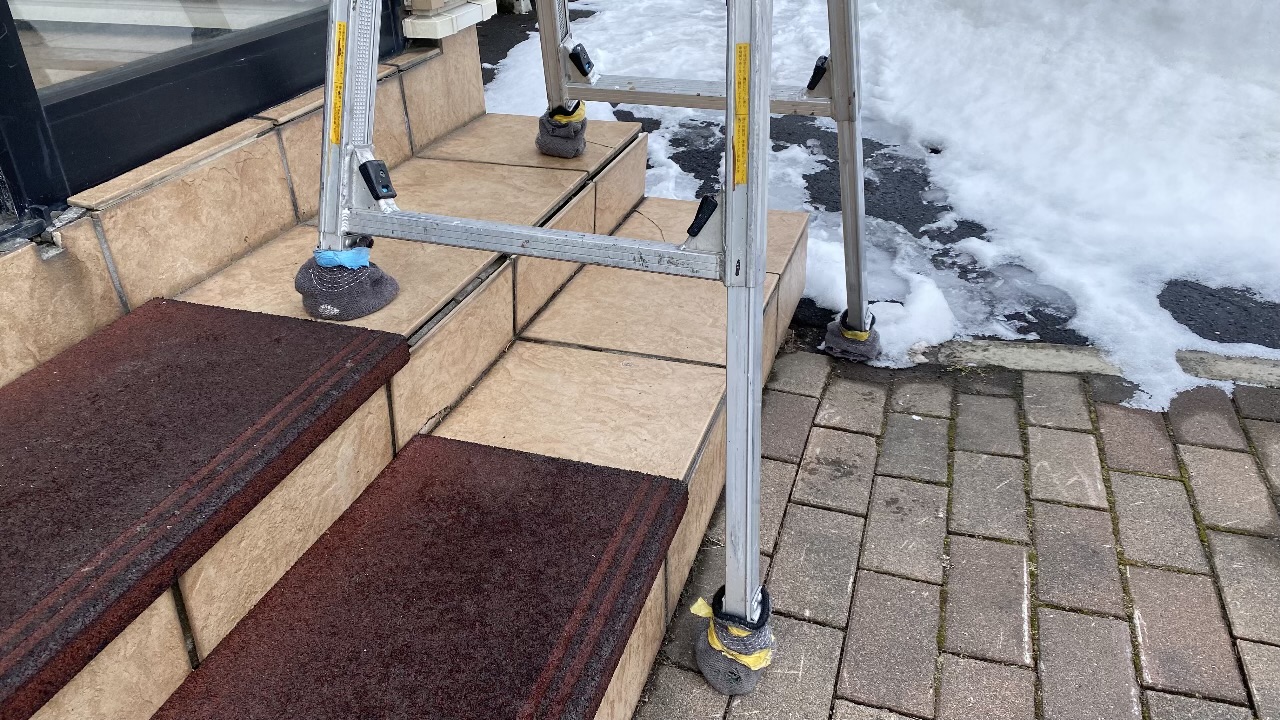 北海道の住宅は、雪に埋もれないよう玄関が階段の上にあることが多いですよね。通常の脚立では段差があるため、不安定で非常に危険です。