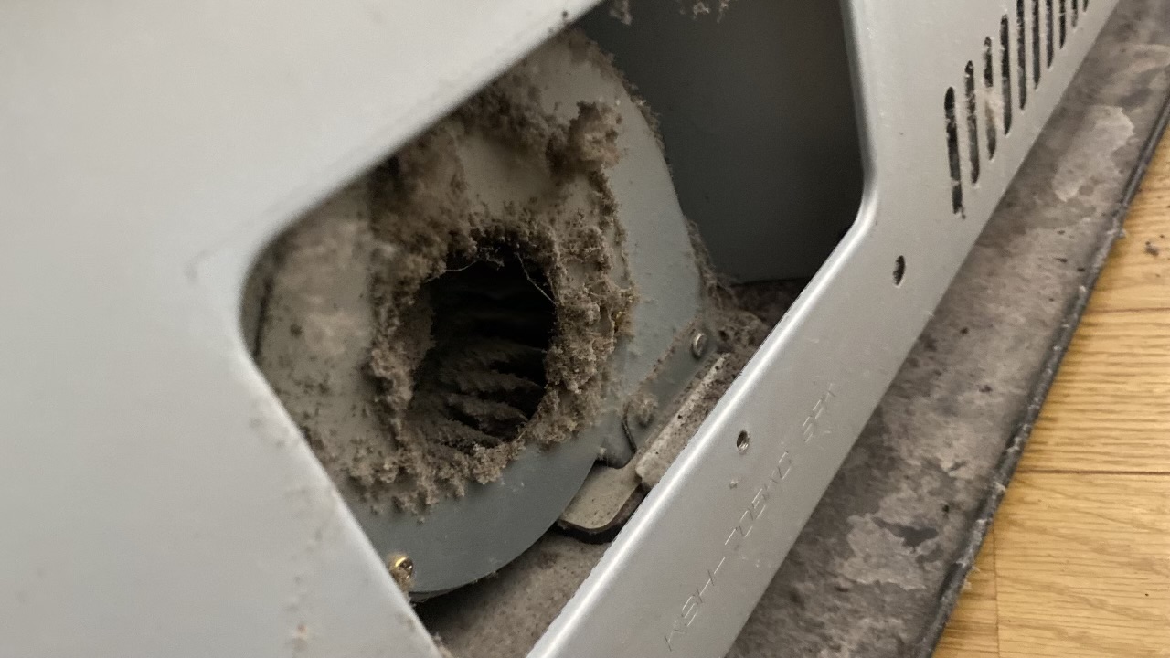 調査の結果、原因はすぐに分かりました。ストーブの裏側にある「空気取り入れ口」のフィルターです。