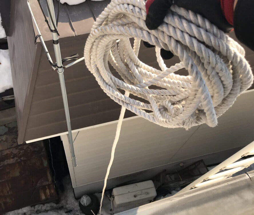 そして自分自身の安全対策として、今回は屋根の上に登ってから「安全ロープ(命綱)」を垂らしました。この綱を体に結びつけることで、万が一梯子から足を踏み外しても地面に落下することを防ぎます。