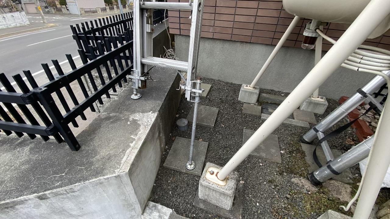 2箇所目の作業現場では、別の課題がありました。梯子の足元が「コンクリートの犬走り」と「砂利」の境界線上にあり、大きな段差があったのです。