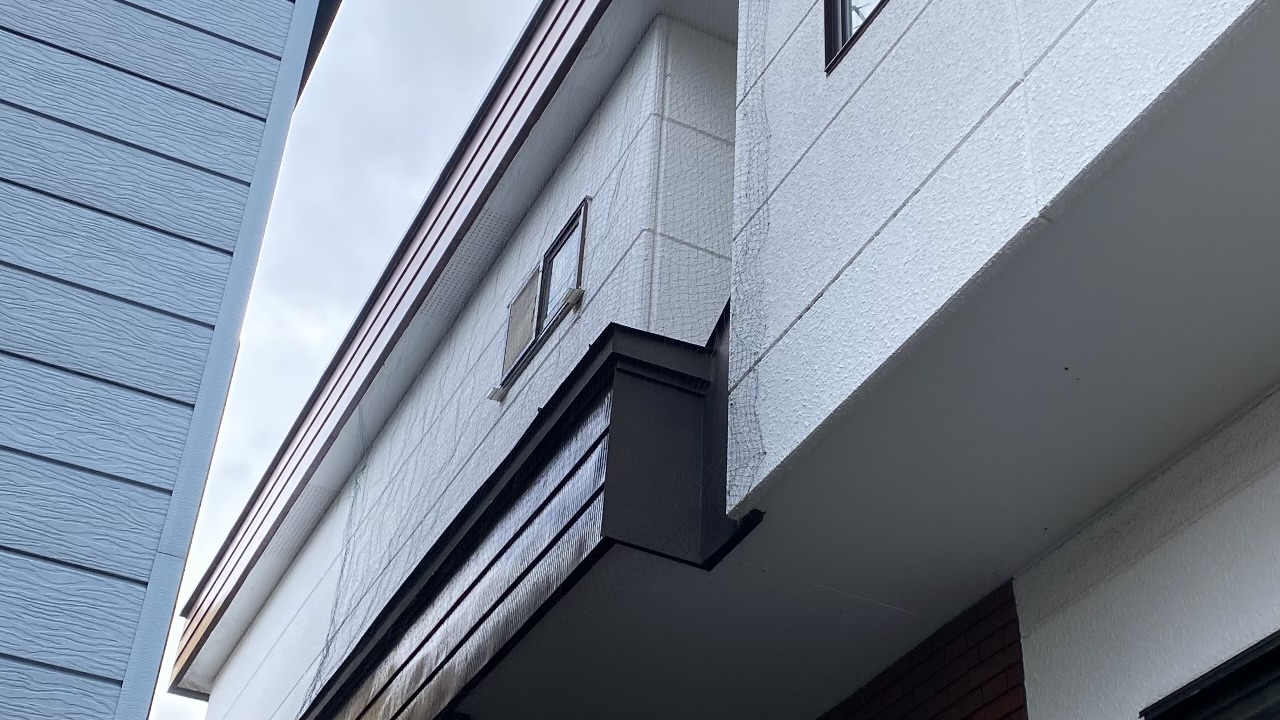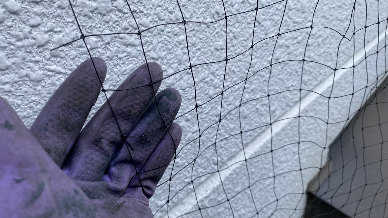 今回使用したのは3m×5mの大型ネットです。天井の軒天ボードから1階の屋根の下までをすっぽりと覆い隠し、鳩が着地する隙間さえ与えないようにガッチリと固定しました。