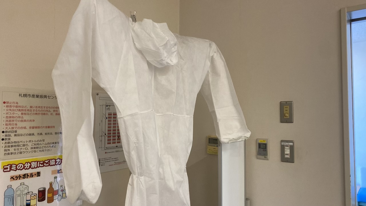 さらに、繊維が皮膚や服に付着して自宅や外部へ持ち出されないよう、全身を覆う専用の防護服(つなぎ)を着用します。