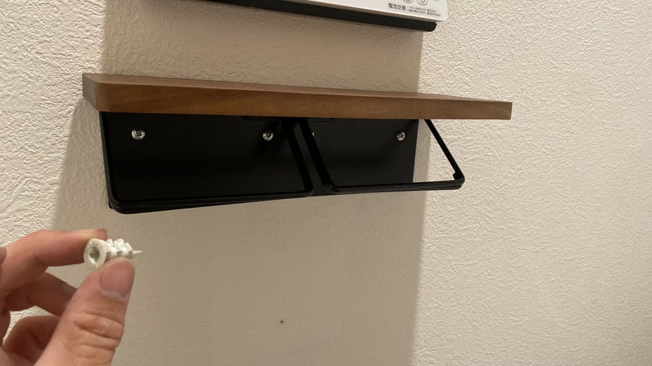 この石膏ボードアンカーを先に壁に埋め込むことで、下地のない壁でもネジをがっちり食い込ませる「受け」を作ることができます。今回は4箇所すべてにアンカーを打ち込み、ホルダーが絶対に脱落しない強度を確保しました。