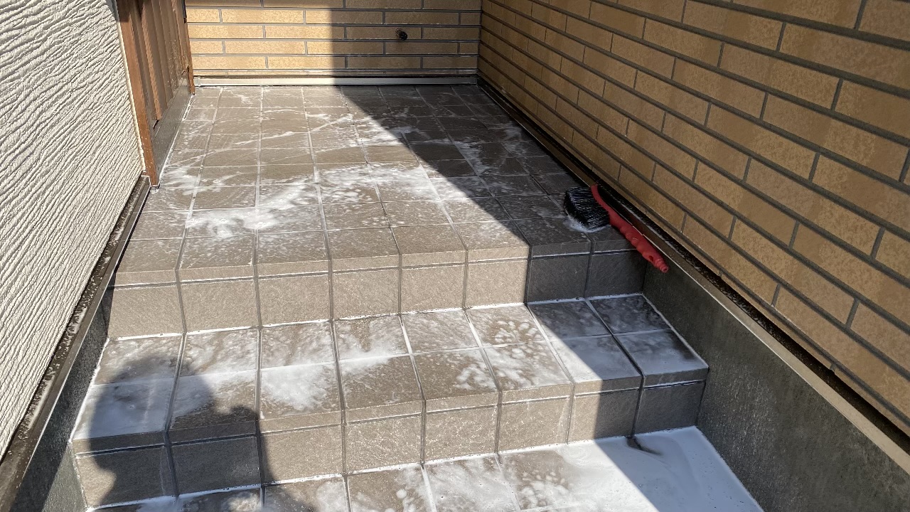 タイル自体は劣化が少なく綺麗なのですが、厄介なのが「目地(めじ)」です。タイルの継ぎ目である目地は汚れが溜まりやすく、特に冬場に運ばれてくる雪解けの泥水などが染み込んでしまうと、ブラシで擦っただけではなかなか落ちない「頑固な黒ずみ」になってしまいます。