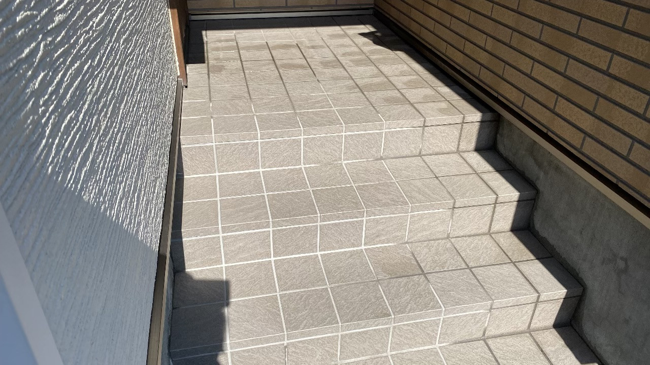 札幌の住宅は、玄関先に数段の階段があり、ドアの前に「風除室(玄関フード)」を設けているタイプが非常に多いです。雨や雪が直接玄関に入るのを防いでくれる便利な空間ですが、床面はタイル仕上げが一般的。