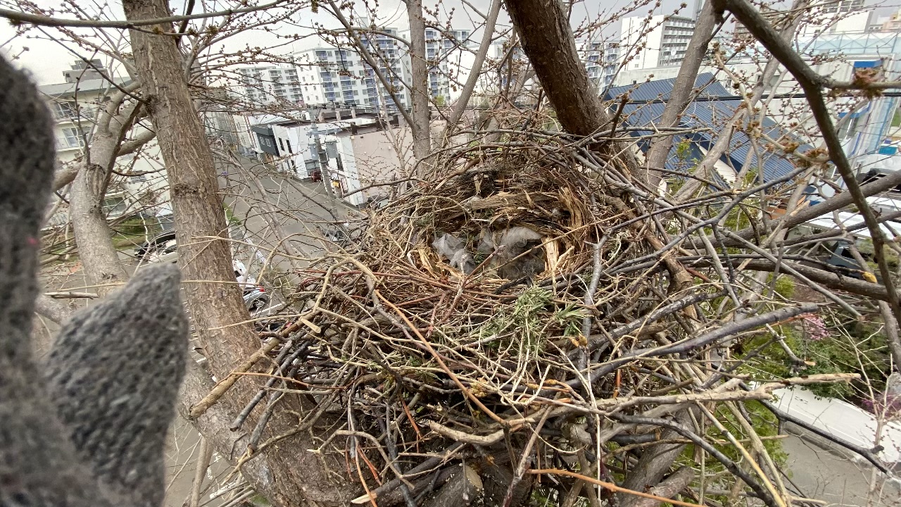 - → 高さ10メートルの位置へ木登り!カラスの巣の撤去作業