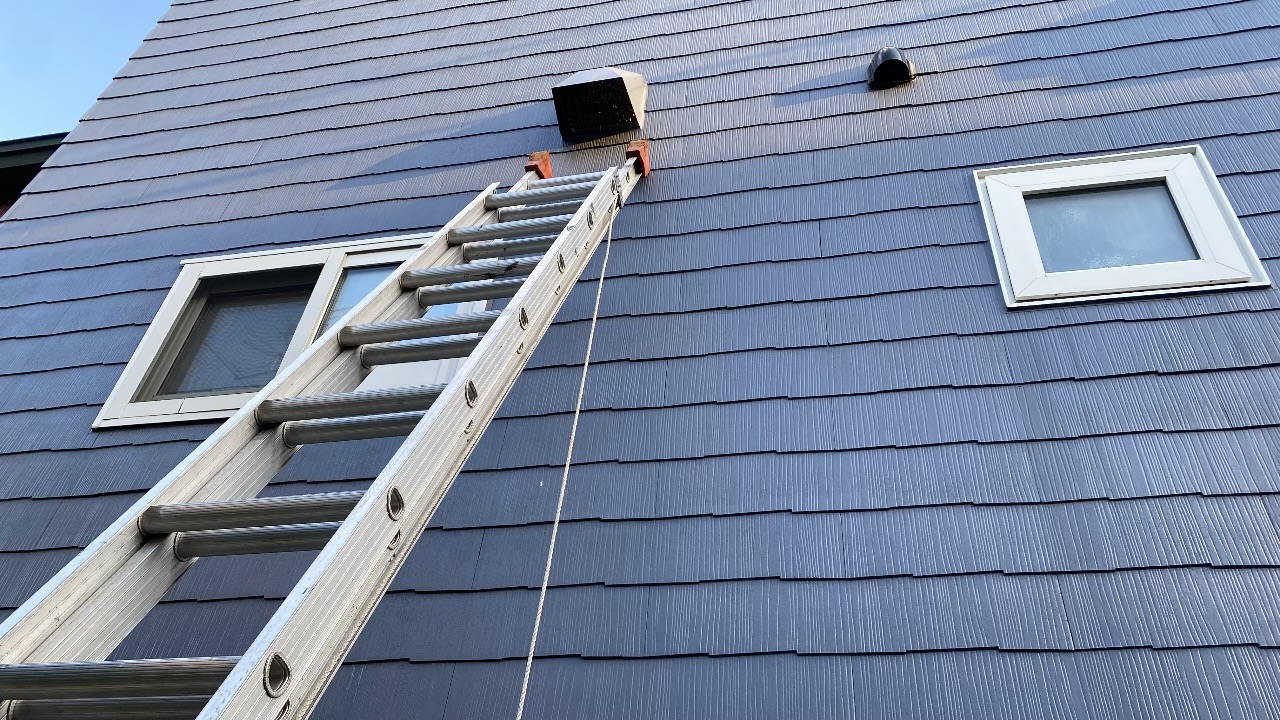 今回の現場は2階の高さ。2段ばしごを立て掛けての作業となります。