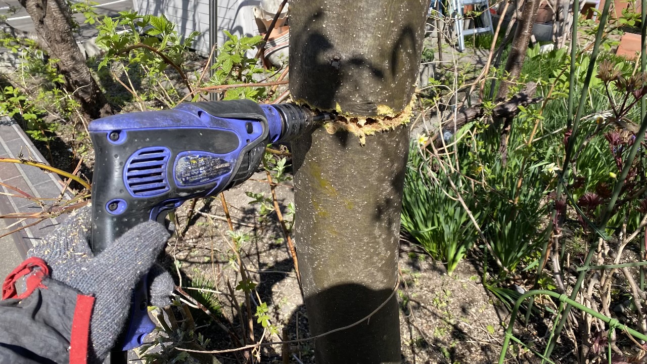 【電動ドリルに木工用ビットを装着し、幹に集中して穴を開けます】